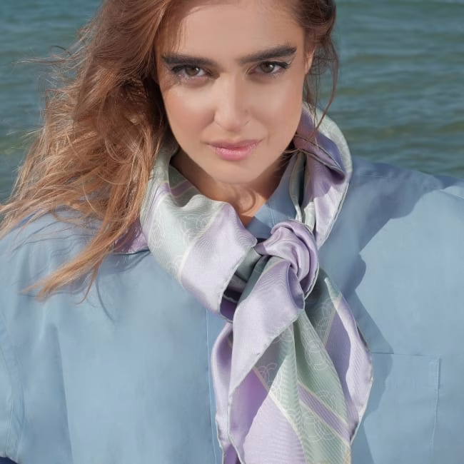 Description: Silk twill scarf with sterling silver Xarizma logo