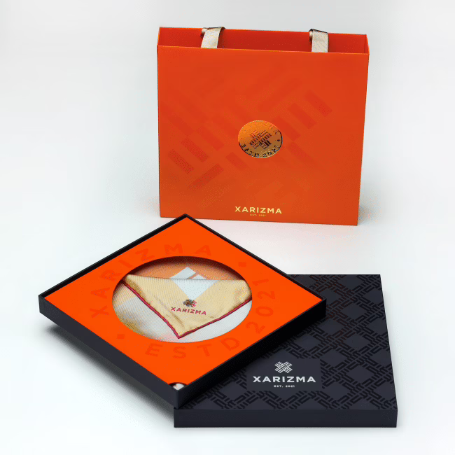 Description: Silk twill scarf with sterling silver Xarizma logo