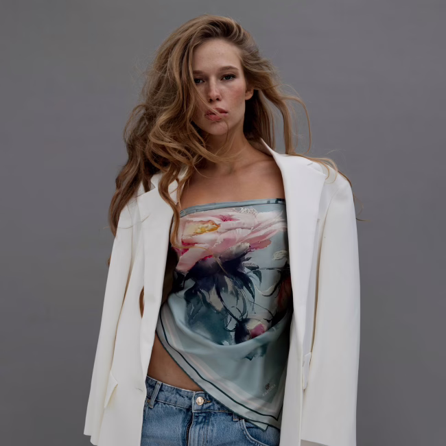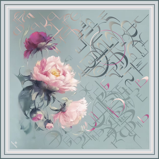 The real art piece is our twill, composed of exquisite letters, silky softness, and silvery elegance. In a most delicate manner, the hand-painted artwork was transferred onto silk to express your wishes for prosperity, wealth, tenderness, youth, and beauty.