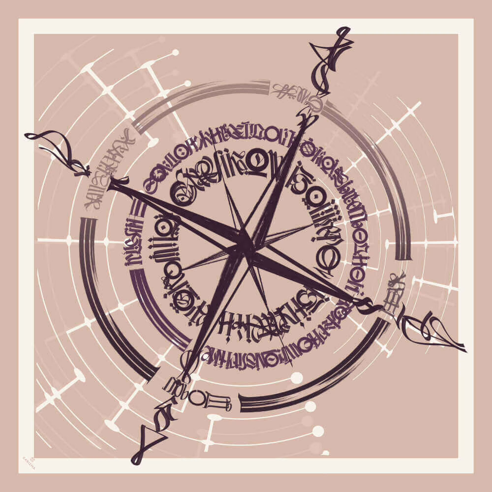 Calligraphy on scarf design: “The arrow of your internal compass should always point in the same direction — towards the goal”. The compass arrows indicate four directions: Charisma, Love, Faith, Strength.